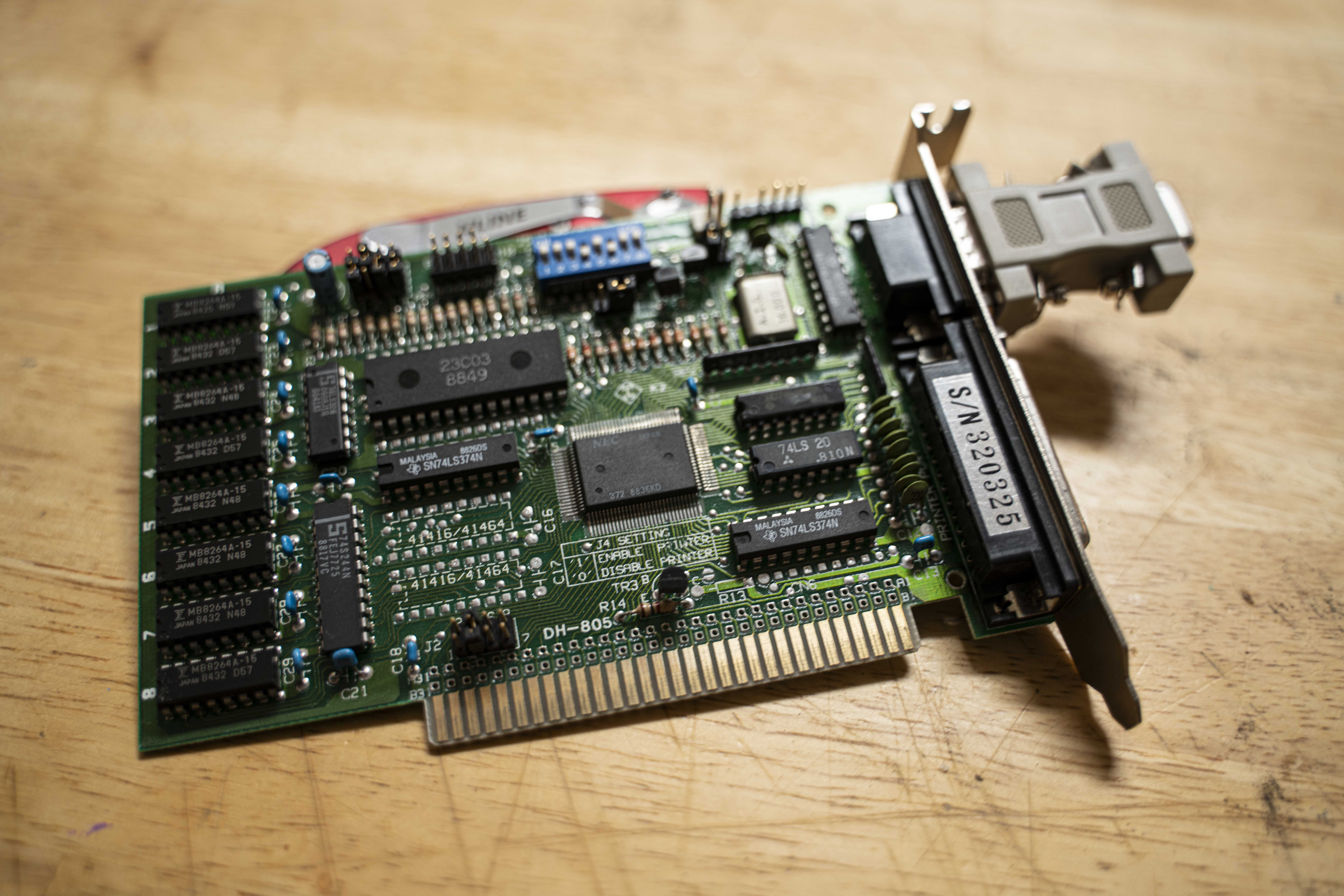 This fills in my other free ISA slot: an 8-bit ISA card (ergo, a PC card) that does CGA graphics. Stuck on the 9-pin port is a passive DB-9 to DB-15 connector so it can pipe to VGA monitors. This can be helpful when testing out Sirius DOS’s Subprime ABI for example, since it only uses text modes.