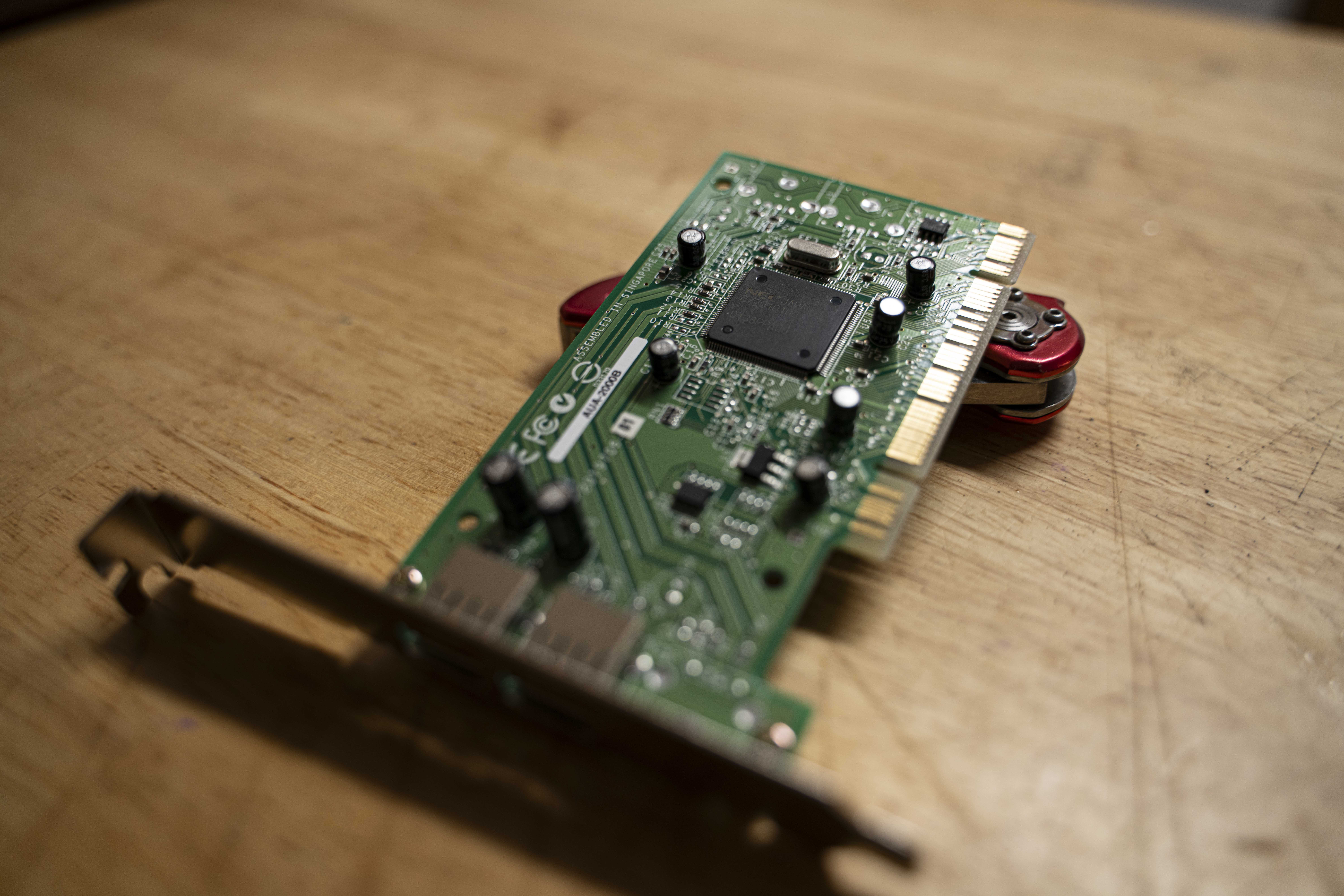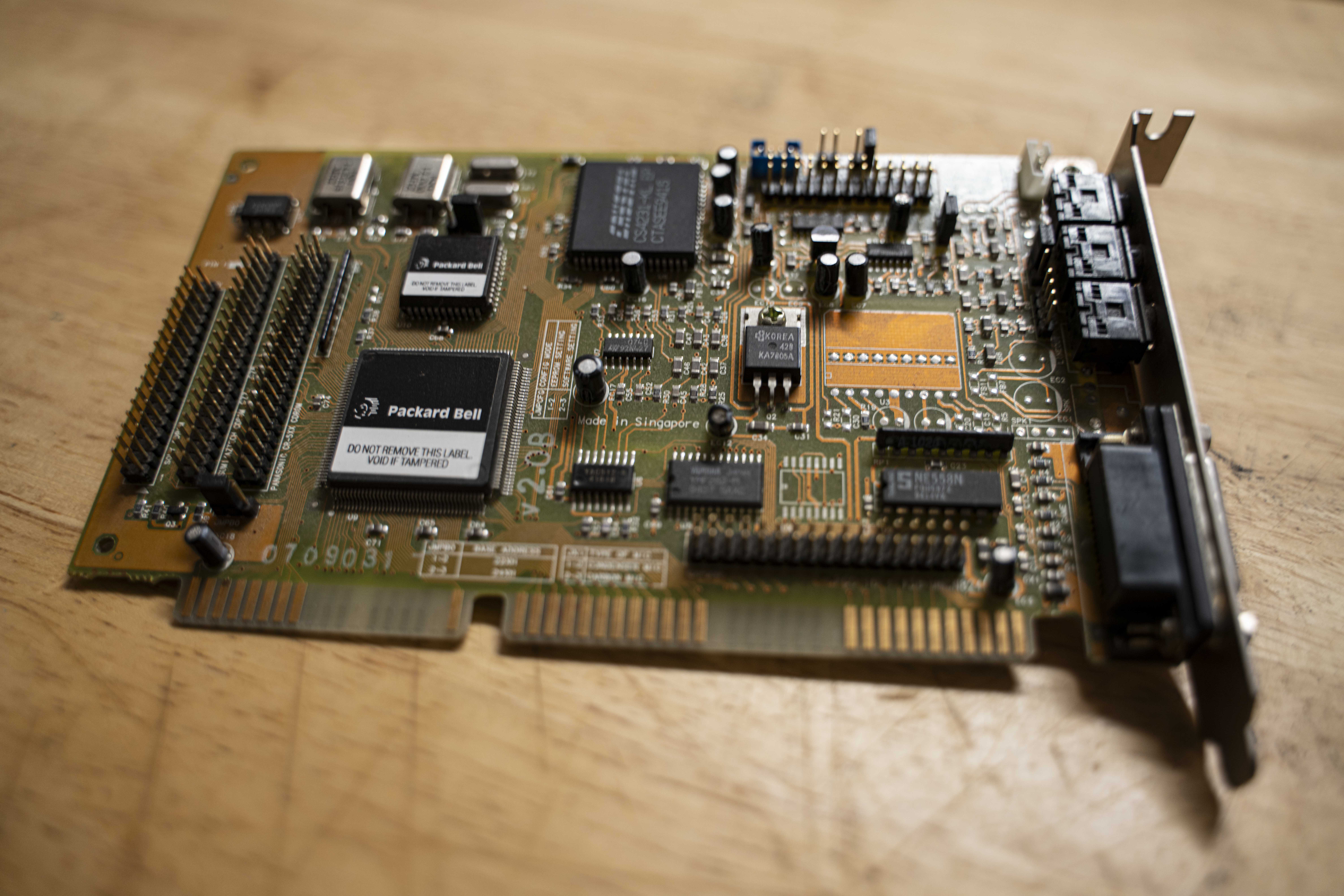 This is my system’s sound card. I bought it because I correctly anticipated my PCI port complement would be completely filled and didn’t want to risk slowing down the other high speed cards with something low bandwidth like a sound card. Like with the USB card, no modern case headers of any kind can be found on this, but at least it provides the usual complement of ⅛″ jacks on the back.
